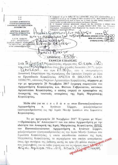 Νομίζουμε την κατάλληλη απάντηση, έδωσε ο ΚΑΤΗΓΟΡΟΥΜΕΝΟΣ ιερομόναχος, γράφοντας επάνω στοεξώδικο που του επιδόθηκε: